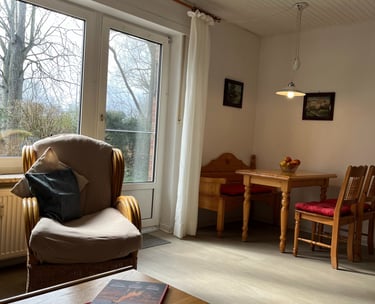 Der große Wohnbereich der Wohnung wurde mit allem ausgestattet, was es braucht, damit sich die Gäste wie Zuhause fühlen. Neben bequemen Sitzmöglichkeiten darf auch ein moderner Flachbildfernseher für die Abende nicht fehlen. Die offene Küche wirkt einladend. Während die Mahlzeiten in der Sitzecke im Landhausstil eingenommen werden können, sitzen Sie auch an der modernen Theke bei einer Tasse Kaffee gemütlich beieinander.